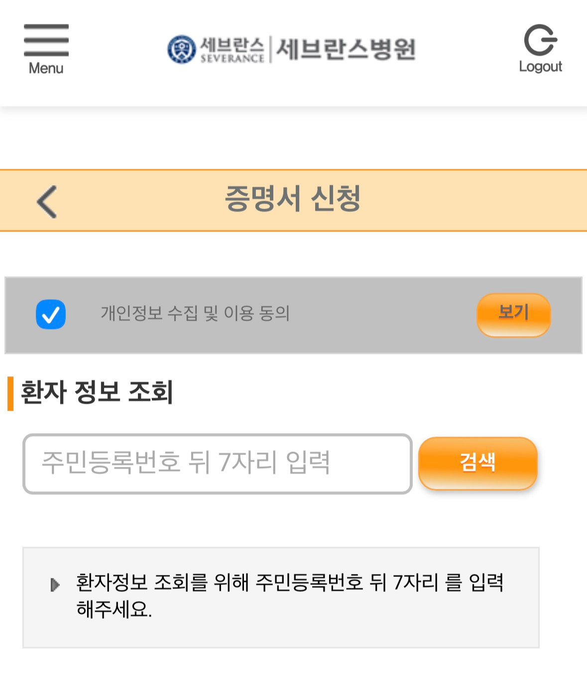 증명서 신청으로 환자 정보 조회를 하기 위해서는 주민등록번호 뒤 7자리 입력을 진행해주세요.