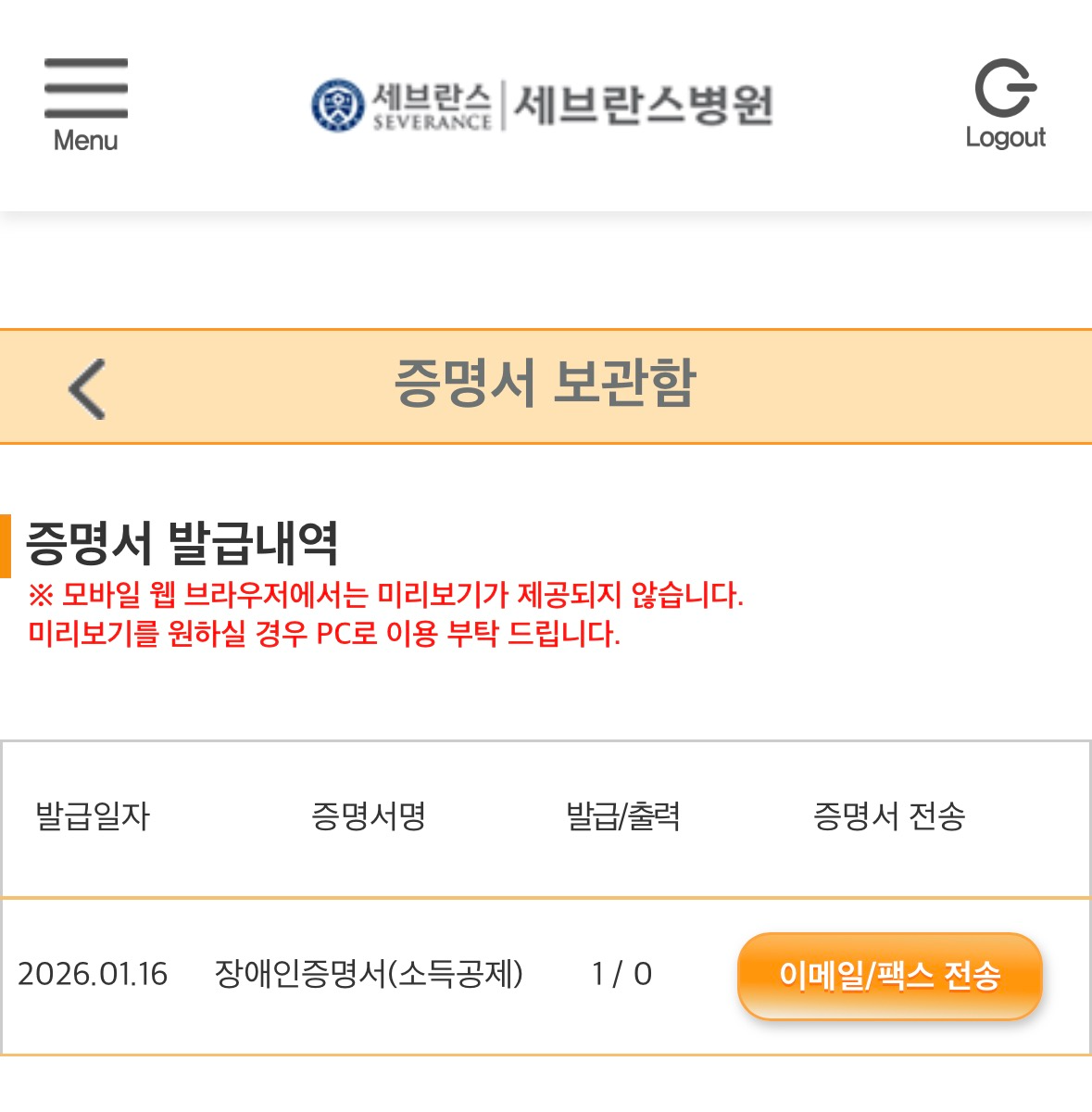 세브란스병원에서 장애인증명서 발급하는 방법을 알려드릴게요. 병원마다 다르기 때문에 직접 병원에 방문해서 증명서를 뽑아야 하는 경우도 있을거지만 저는 세브란스병원을 다니고 있는데 온라인 발급이 가능하더라구요. 컴퓨터로도 가능하고, 모바일로도 가능합니다.