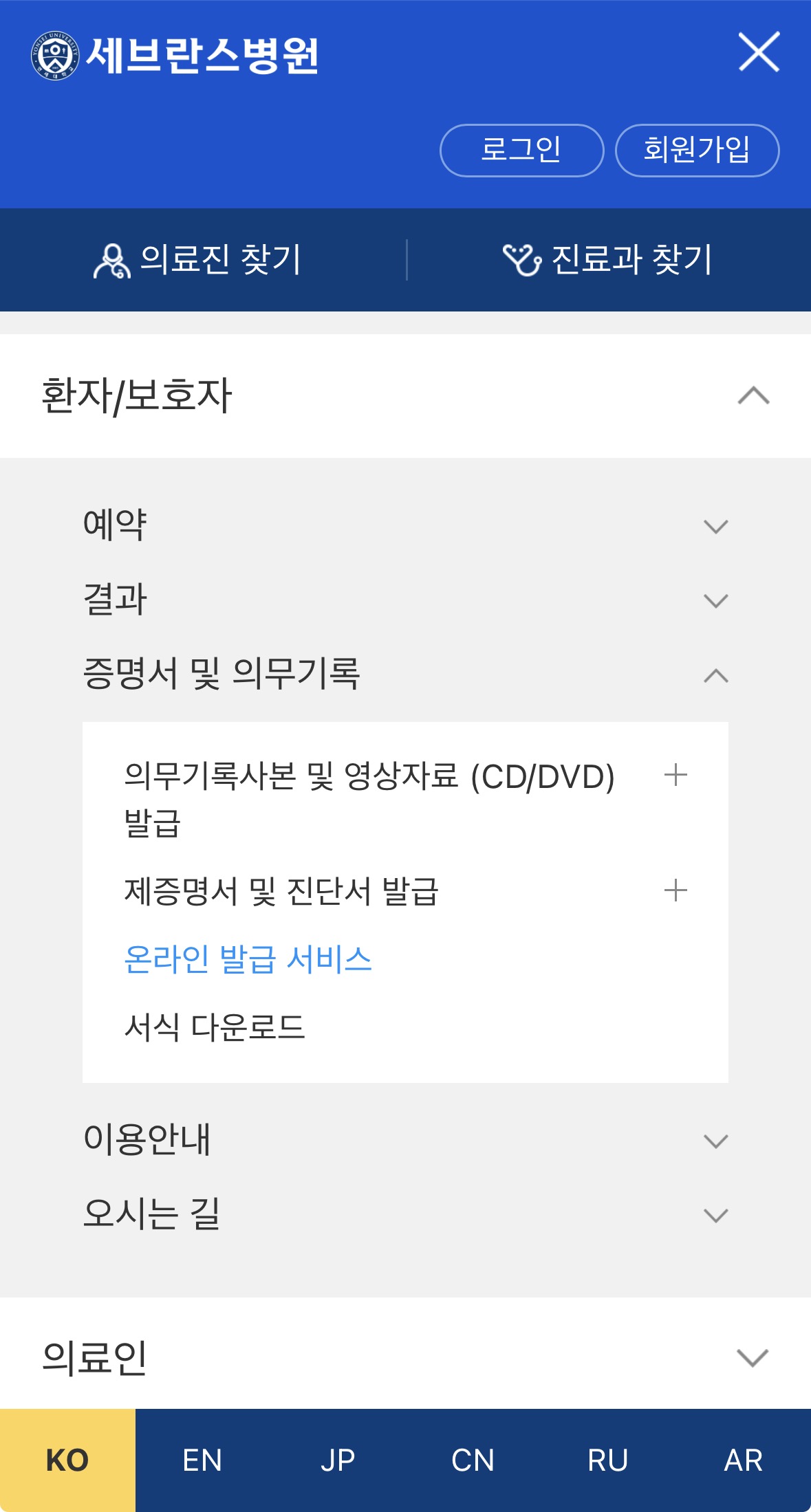 우선 세브란스병원 홈페이지에 들어가서 메뉴를 눌러주신 후 환자/보호자를 눌리고 증명서 및 의무기록을 클릭해주세요.