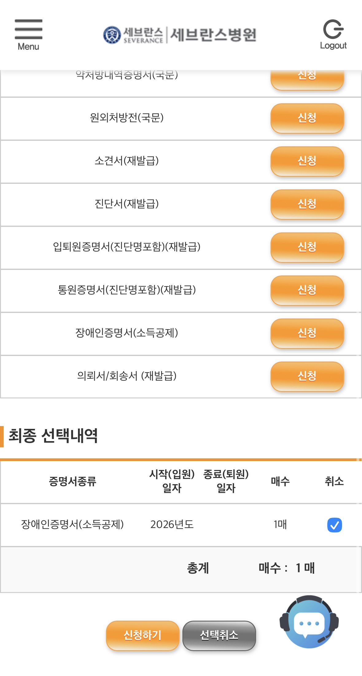 이렇게 선택해주면 장애인증명서(소득공제) 온라인 발급 완료! 세브란스 병원에 직접 가지 않아도 발급이 가능하니까요. 지방에 거주하고 있거나 직접 방문하는게 어려우신분들께서는 이렇게 온라인으로 발급을 진행해주시면 됩니다.
