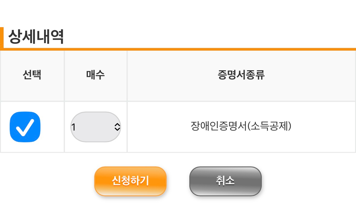 장애인증명서(소득공제)의 매수를 지정하고 신청하기를 눌려주신 뒤