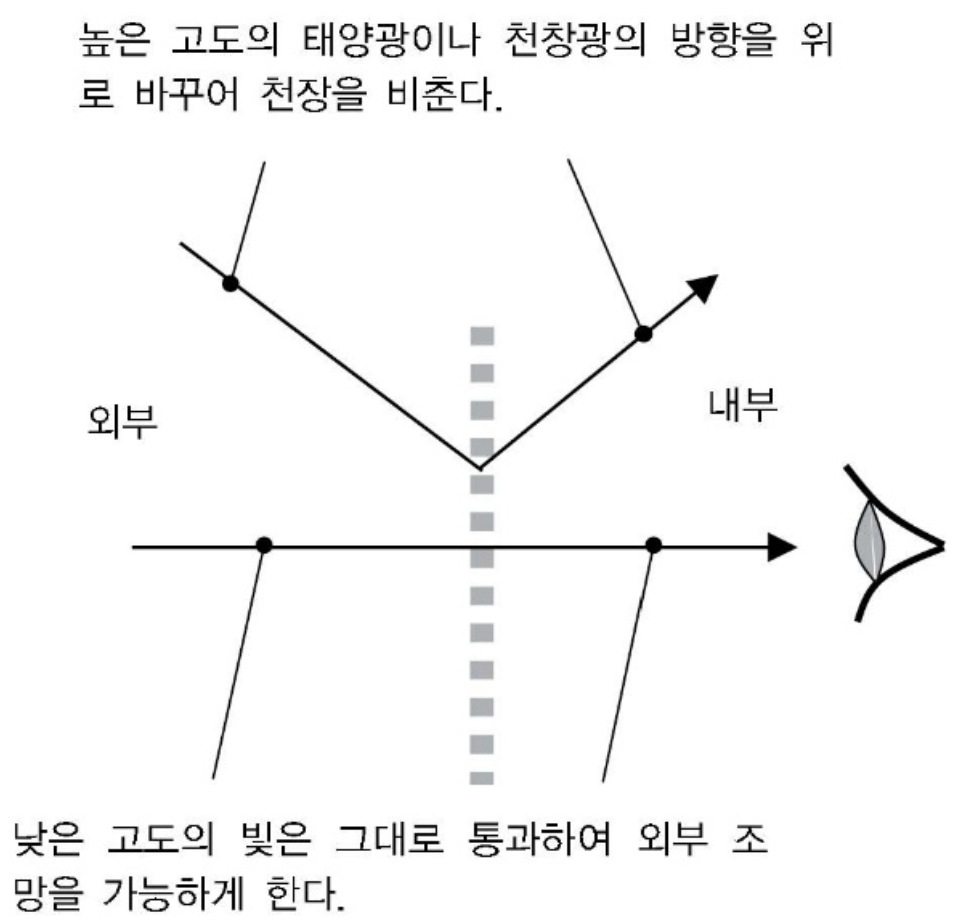 수평으로 설치된 반사판인 광선반을 사용하여 주광이 창 주위만 강하게 비추는 대신, 천장으로 빛을 반사하여 공간 깊은 곳까지 확산광을 제공할 수 있다.