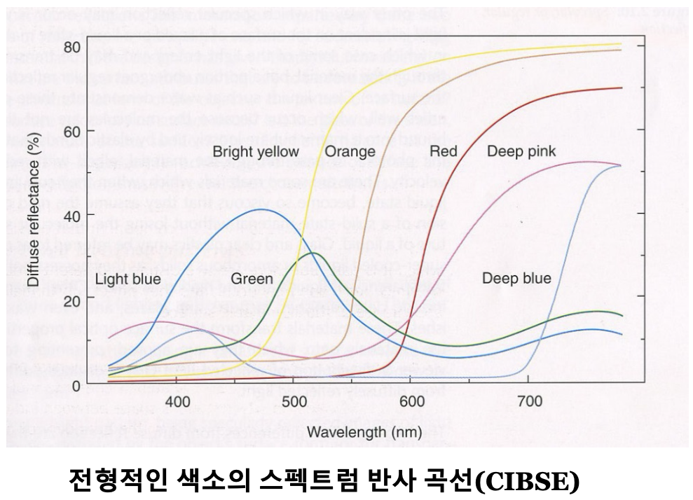 - 일반적으로 백색 벽을 반사율 0.8이상으로 유지하는 것은 어려운 반면, 새로 칠한 매트(무광택) 백색 페인트는 0.95의 반사율을 가짐