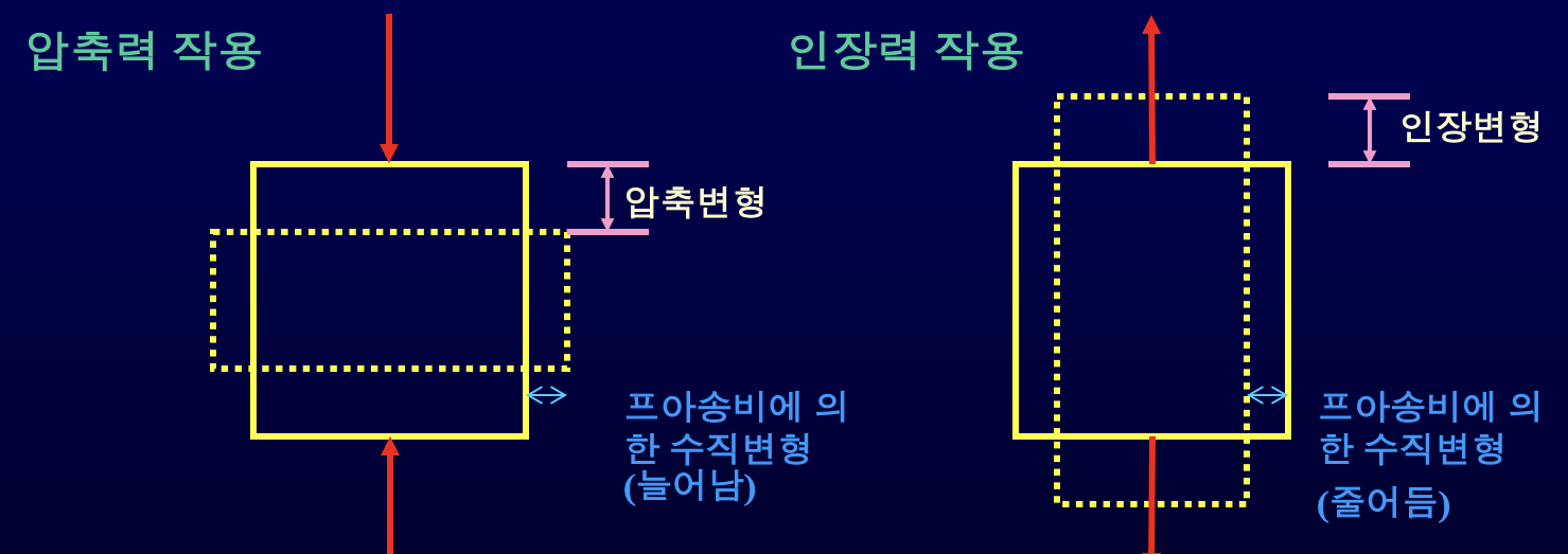 - 프아송 비(poisson's ratio): 하중방향의 수직방향의 변형에 대한 비율