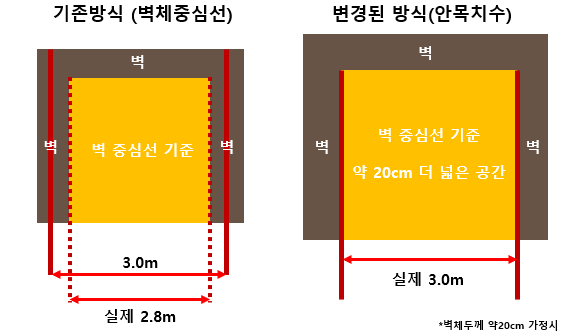 기존의 건축물의 경우에는 벽체 중심선을 기준으로 면적을 측정을 했습니다. 그렇기 때문에 같은 84타입이라고 했을때 옛날의 집보다 최근의 집들이 더욱 넓어보이는 이유가 바로 이것 때문이죠. 예를 들면 3.0M의 방에서 벽체 두께가 약 20CM라고 가정을 하면 실제로 사용할 수 있는 면적은 2.8M였습니다. 하지만 최근에 변경된 방식은 이와 다르게 정말 우리가 사용하는 면적을 측정하는 방식으로 안목치수에 의해서 면적을 측정하게 됩니다.