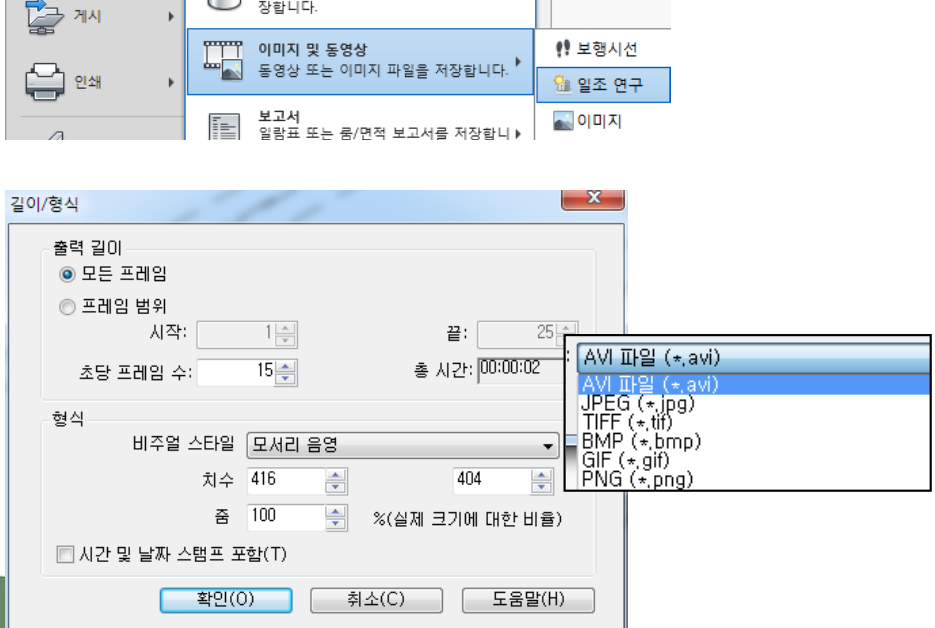 - 이미지파일 - 시간 날짜 스탬프 포함, 내보내기 포맷은 이미지 포맷(jpg or png)을 선택 (프레임 수가 적어 avi 적합하지 않습니다.)