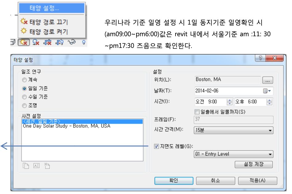 - 태양설정 - 일조연구 : 일일기준 , 위치, 날짜 : 동지기준, 시간 : 오전 9시~ 오후 6시, 시간간격 : 15분