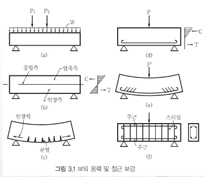 - 보에서 압축력은 콘크리트, 인장력은 철근이 저항