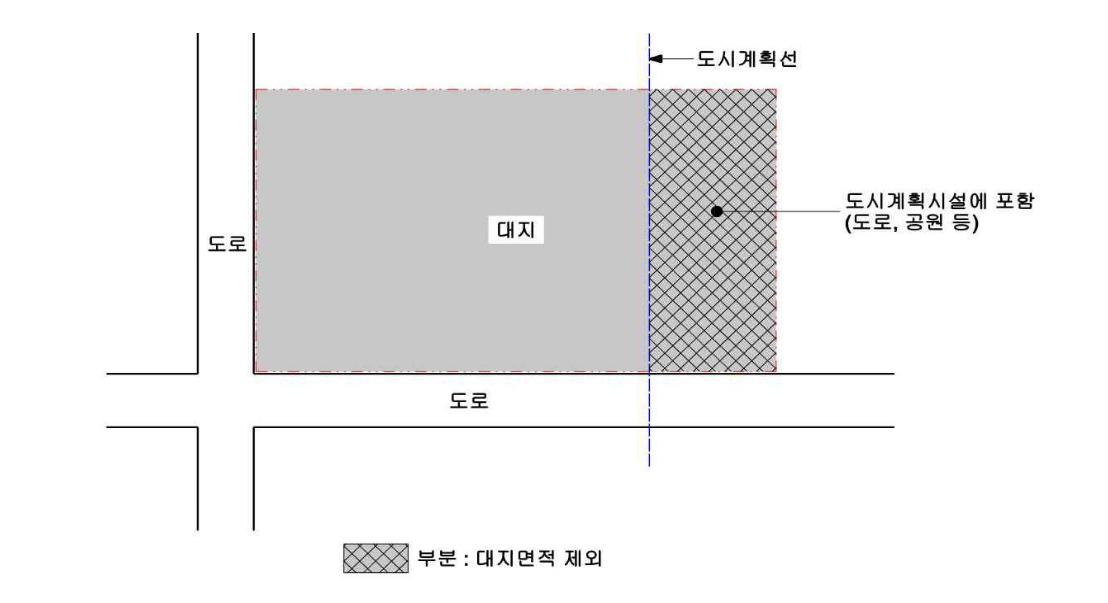 대지에 도서 군계획시설인 도로 공원 등이 있는 경우 : 그 도시 군계획시설에 포함되는 대지 국토의 계획 및 이용에 관한 법률 제 47조제7항에 따라 건축물 또는 공작물을 설치하는 도시 군계획시설의 부지는 제외하는 면적