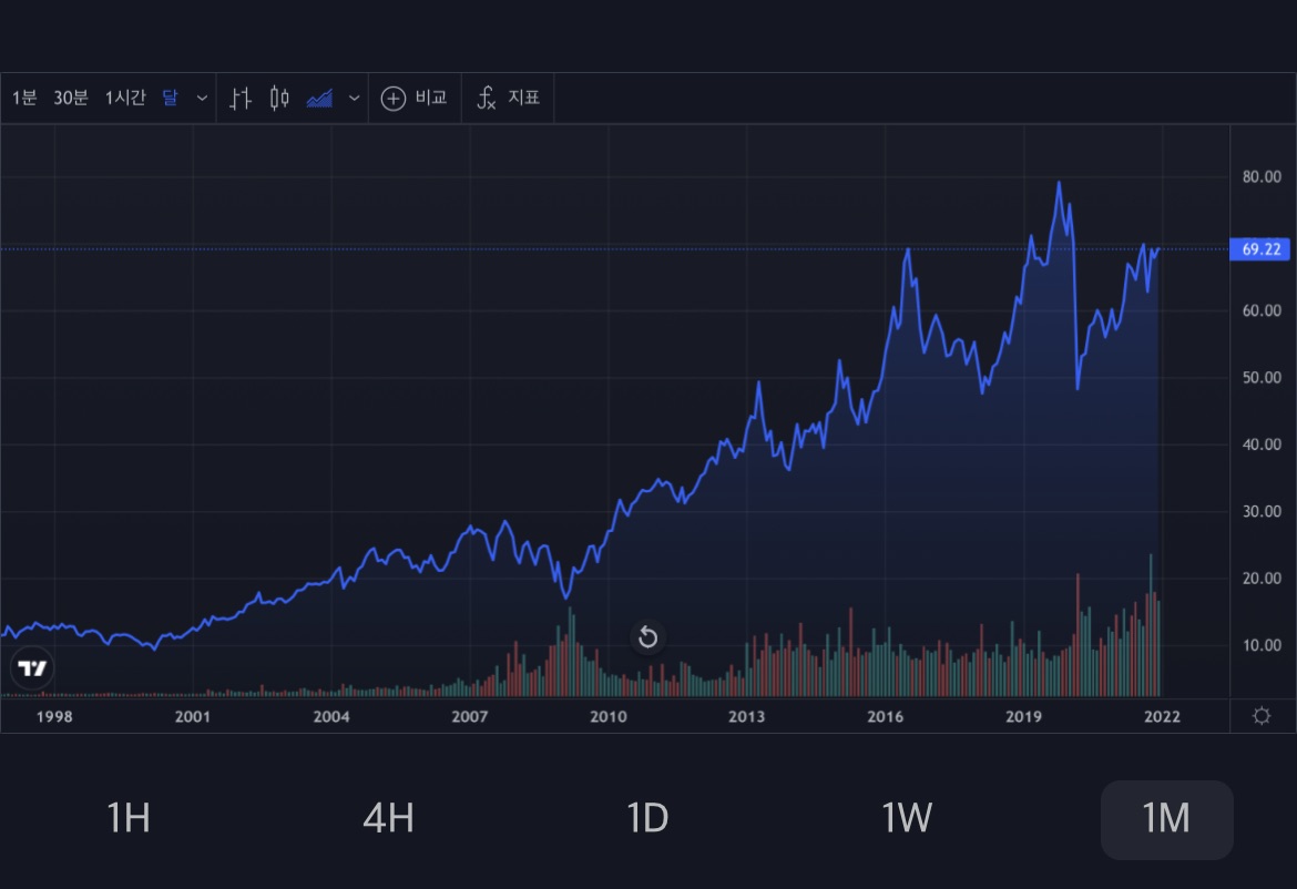 1994년 10월 18일에 상장 후 2021년까지 계속해 배당을 주는 기업입니다.