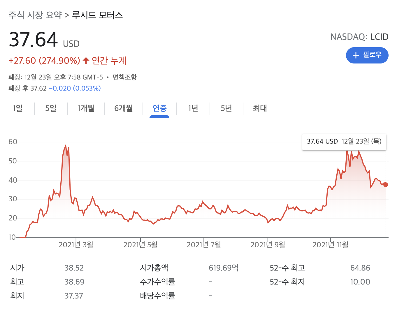 현재 루시드의 주가는 12월 23일 기준 37.64 달러로 시장을 마무리 했습니다.