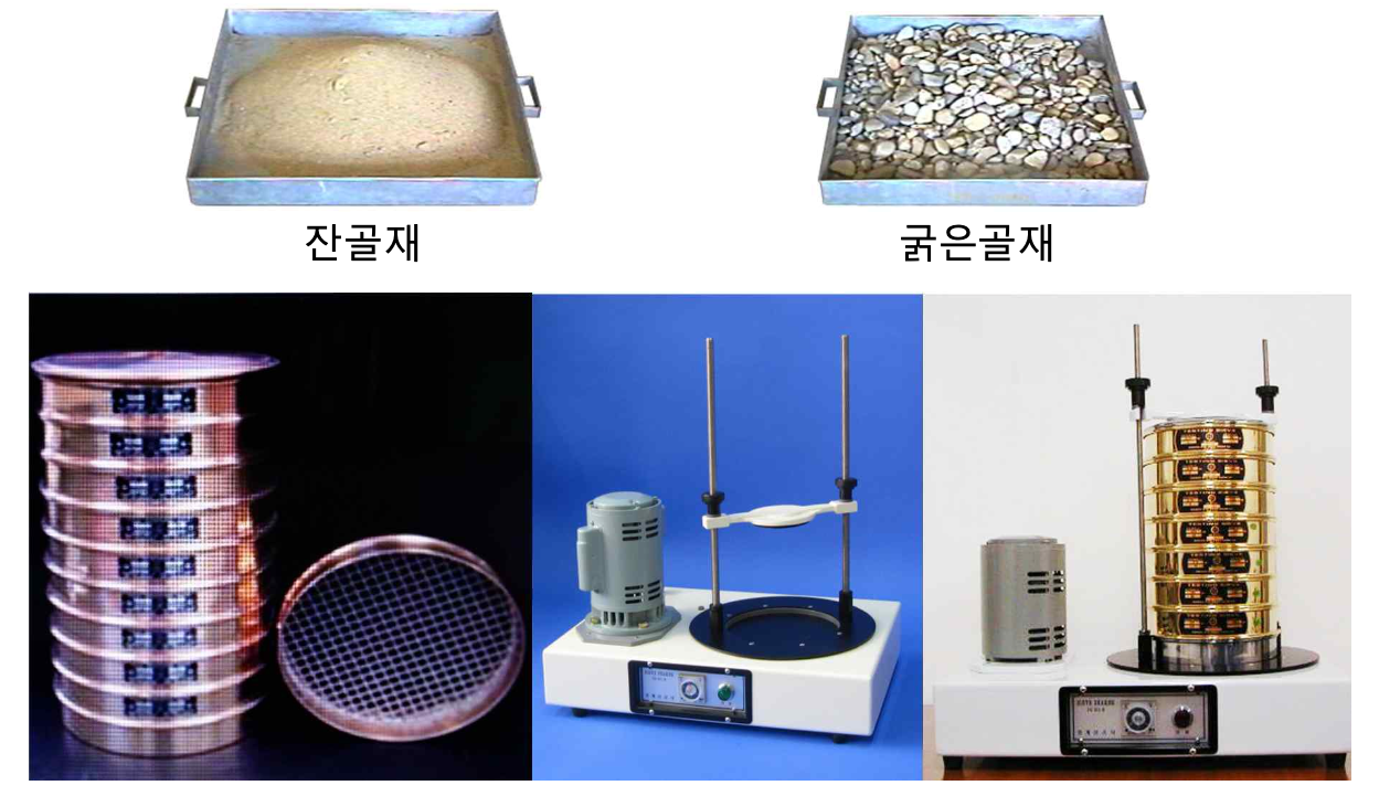 - 잔골재: 5mm체를 다 통과하여 0.08mm체에 다 남은 골재 굵은골재 : 5mm 체에 다 남은 골재