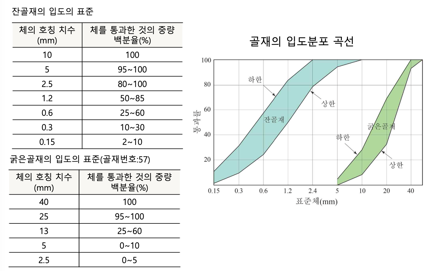 - 잔골재 : 10mm체를 전부 통과하고 5mm체를 거의 다 통과하여 0.08mm체에 거의 다 남은 골재