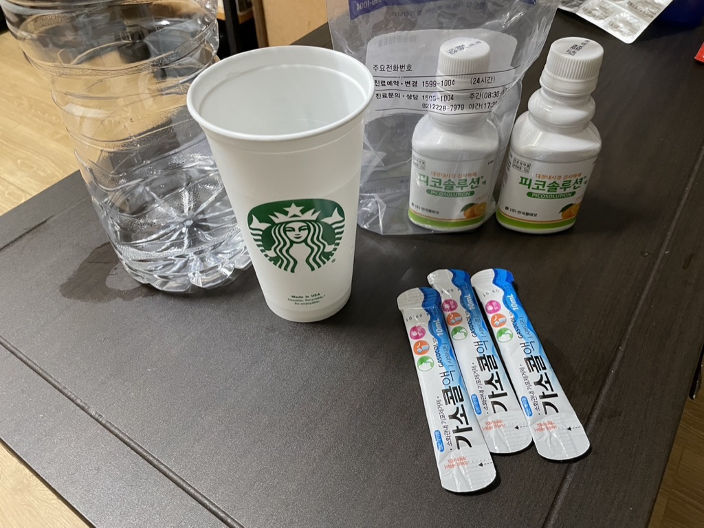 그리고 다음날 아침5시에 다시 한 병을 추가적으로 드시게 됩니다. 그리고 2시간동안 다시 한 번 물을 마셔주세요. 그리고 가장 마지막에 섭취하는 물을 드실때는 가소콜을 같이 마셔주시면 됩니다. 하루종일 잠도 제대로 못 자고 화장실을 들락날락했던것을 생각하면 정말 힘든 것 같습니다.