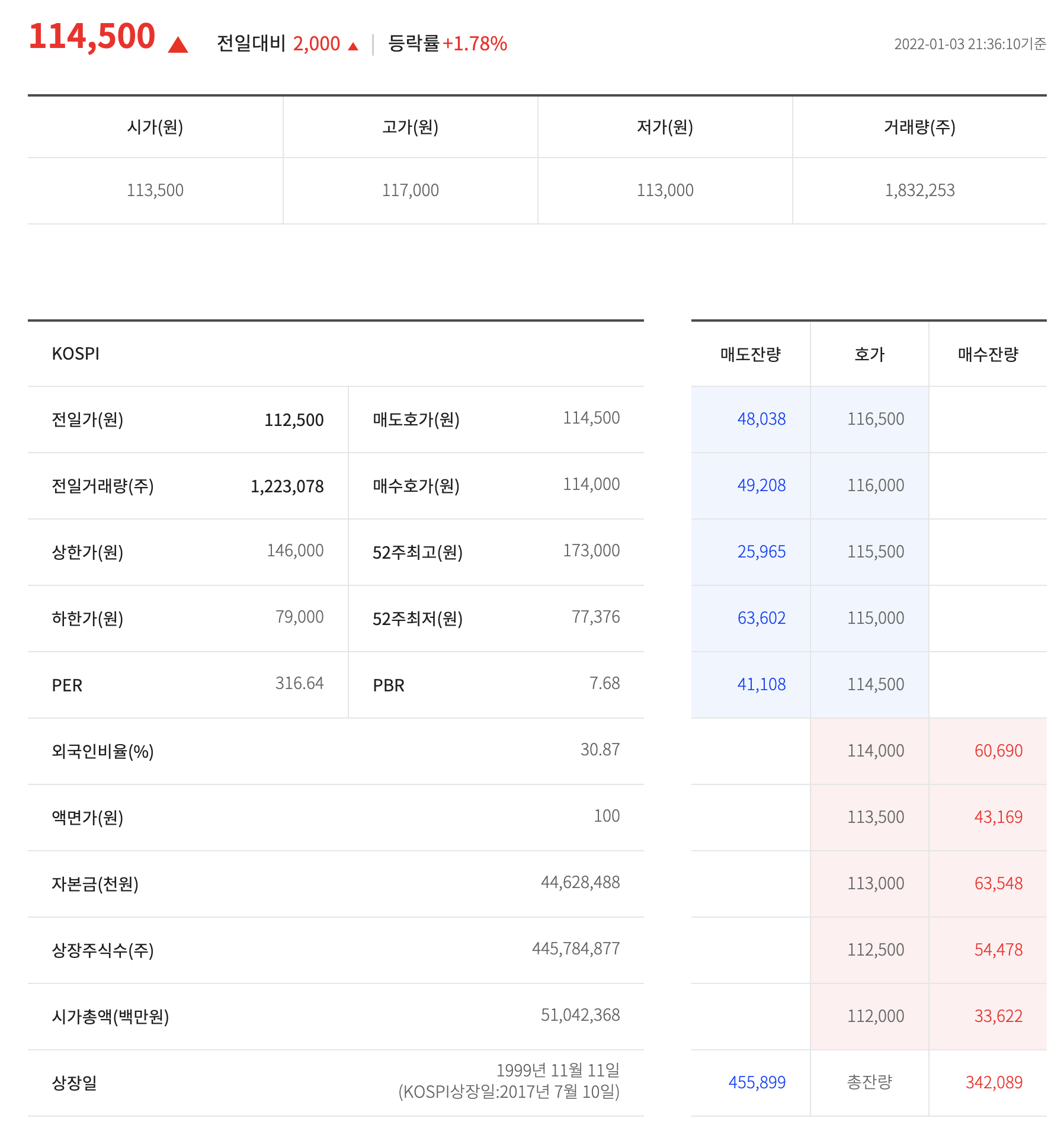 기준으로 2021년 6월 23일 한때 170,000원을 돌파하였습니다.