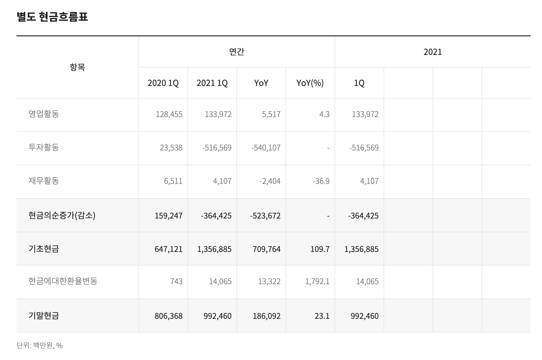 현금흐름표를 보면 투자활동으로 마이너스 현금과 현금의 순증가에서 감소를 보이고 있습니다.