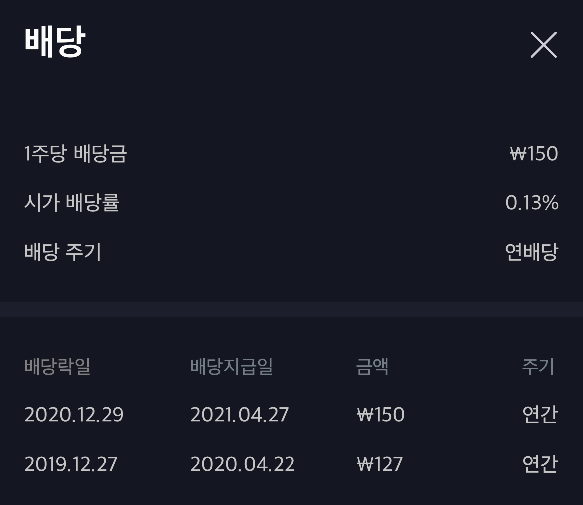 배당은 2020년 기준 150원으로 0.13% 정도의 배당을 주고 있으며 배당 지급일은 4월 말입니다.