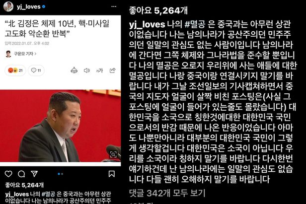 김정은과 북한에 대한 멸공 인스타를 작성한 뒤 사회주의에 대한 반감이 그대로 중국에 대한 멸공으로