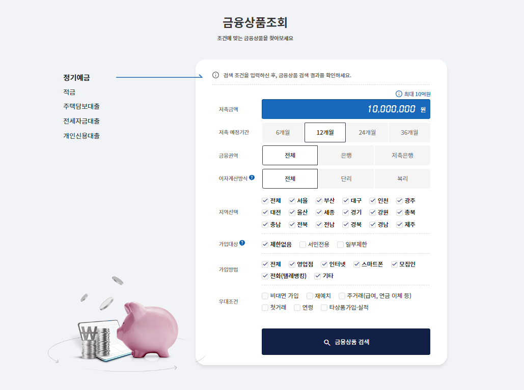 금융상품조회에서 조건에 맞는 금융상품을 찾아볼 수 있는데요. 정기예금, 적금, 주택담보대출, 전세자금대출, 개인신용대출을 살펴보면 저축금액을 작성하고 저축 예정기간과 금융권역, 이자계산방식, 지역산정, 가입대상, 가입방법, 우대조건 등을 설정해서 금융상품을 조회할 수 있어요.