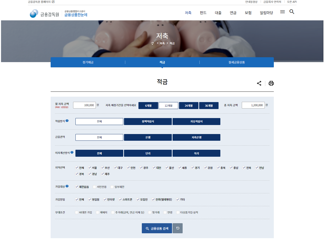 금융감독원에서는 정보의 공시 및 정보제공을 목적으로 하고 있지 가입을 요구하거나 가입이 가능하지 않습니다. 저축뿐만 아니라 대출이나 보험, 연금 역시 이런 방법을 통해서 비교 검색이 가능하다고 하니까. 금융감독원을 이용해서 많은 정보를 알아보는게 어떨까 싶습니다.