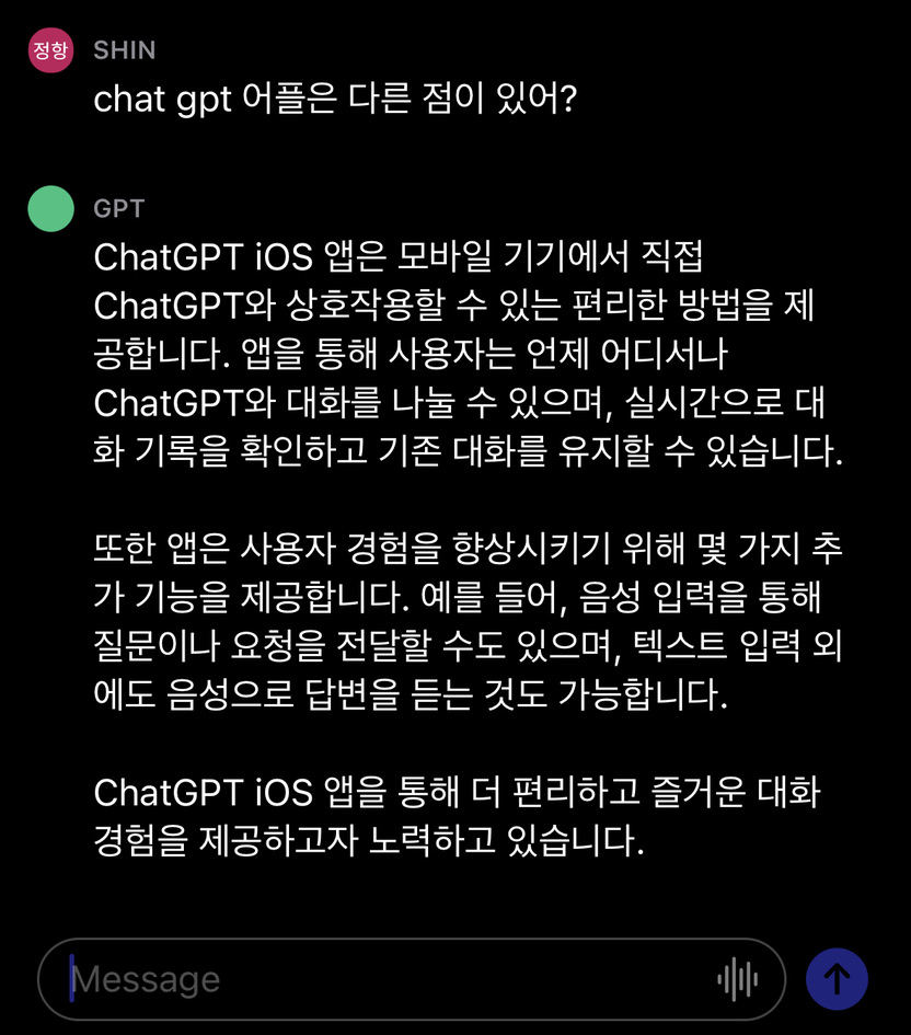 chat gpt 어플의 다른 점에 대해서 질문을 해봤습니다. CHAT GPT ios 앱은 모바일 기기에서 직접 chat gpt와 상호작용을 할 수 있는 편리한 방법을 제공하고 있고 앱을 통해 사용자는 언제 어디서나 chat gpt와 대화를 나눌 수 있으며 실시간으로 대화 기록을 확인하고 기존 대화를 유지할 수 있다고 말해주네요.