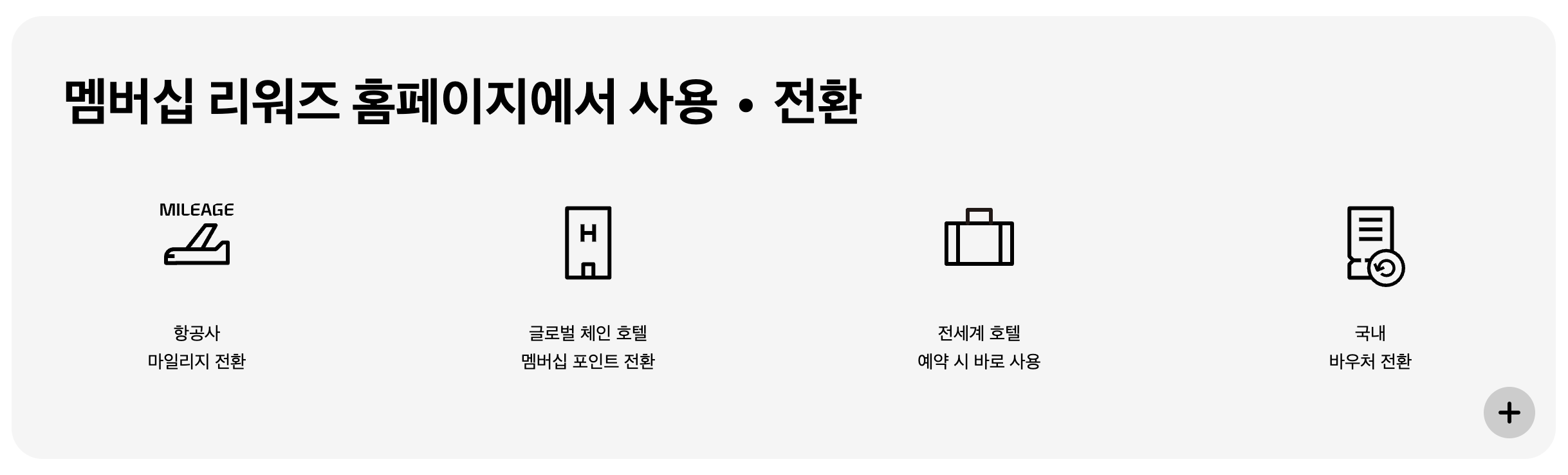 항공사 마일리 전환과 호텔 멤버십 포인트 전환, 국내 바우처 전환 등의 멤버십 리워즈를 활용할 수 있는데요.
