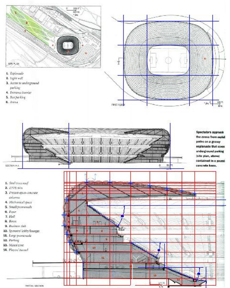 아럽스포츠(ArupSports)의 디자이너들은 각형강관(Hollow Structural Sections)을 구조체에 사용하고 사 전 제작된 여러 방향으로 엉킨 각형강관 부품들로 조립 가능한 구조체를 컴퓨터 소프트웨어를 이용하여 디자인했다. 첨단 BIM을 구현한 것이었다.