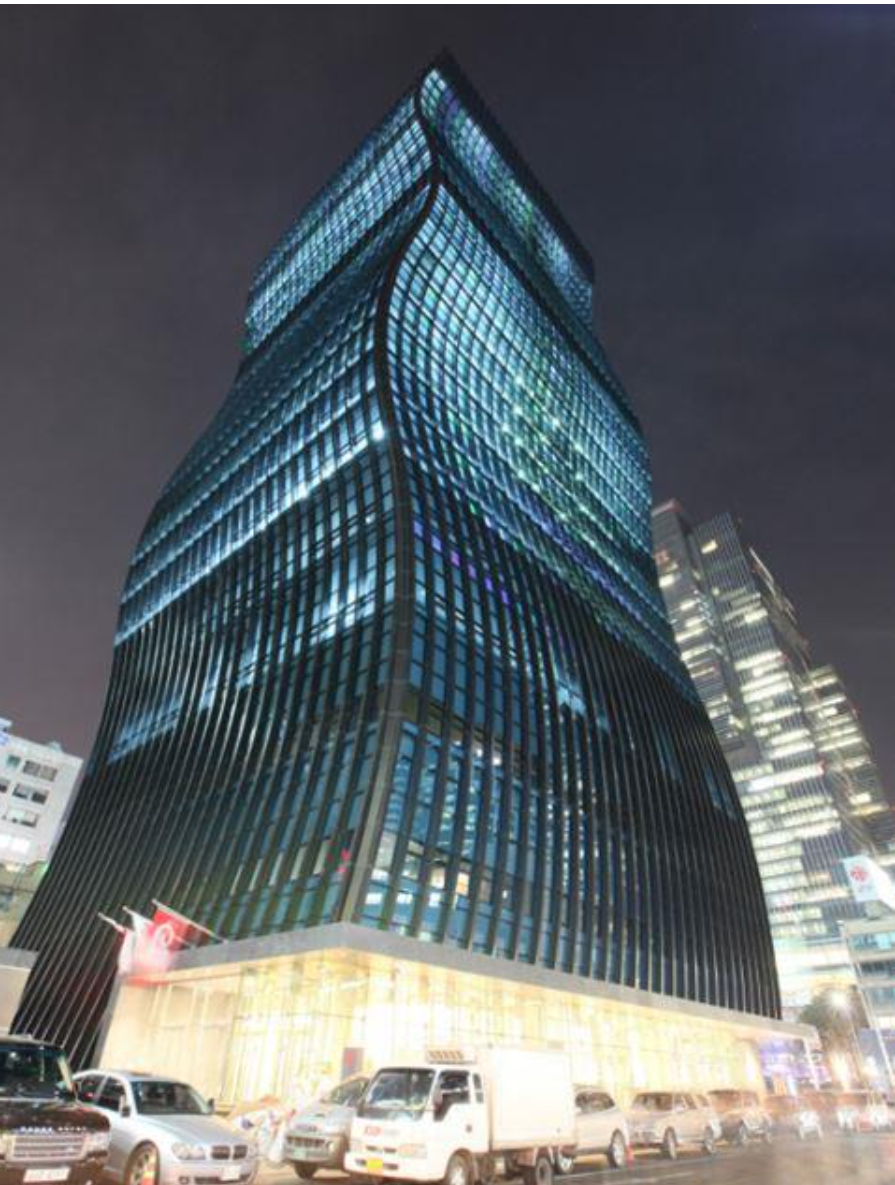 최근 강남에 준공되어 이슈가 된 S자형 외관의 GT타워는 콘셉트 디자인 단계에서 전통적인 굴곡진 형태와 주변자연의 곡선 형태에서 나오는 실루엣을 외관에 적용하였어요. 또한 콘크리트 벽으로 정형화된 다른 건물과 차별화 시키고자 투명하고 신비로운 비취색을 건물에 적용하고자 커튼월 외관에 로이복층유리를 적용하였다.