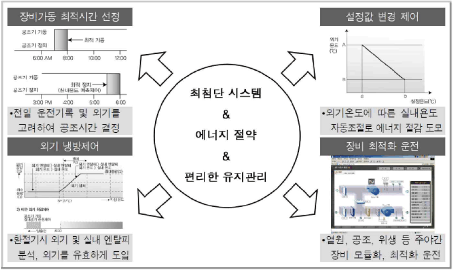 최첨단 시스템 & 에너지 절약 & 편리한 유지관리를 할 수 있도록 장비가동 최적시간을 선정하여 전일 운전기록 및 외기를 고려하여 공조시간 결정을 합니다. 또한 설정값 변경 제어를 통해 외기온도에 따른 실내온도 자동조절로 에너지 절감을 도모합니다. 또한 외기 냉방제어를 통해 환절기시 외기 및 실내 엔탈피 분석, 외기를 유효하게 도입합니다. 장비 최적화 운전은 열원, 공조, 위생 등 주야간 장비 모듈화, 최적화 운전을 합니다.