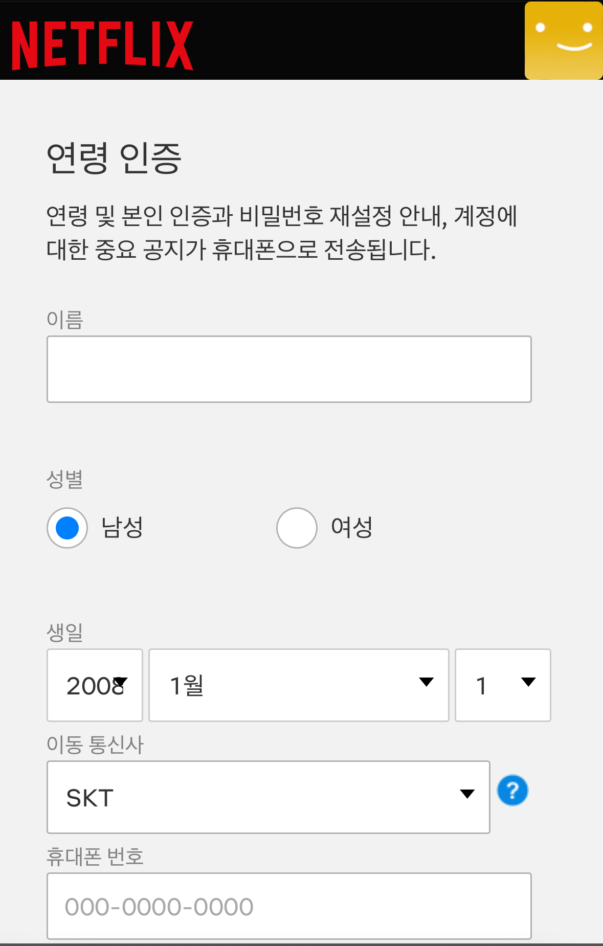 넷플릭스 사이트에 접속이 되어 연령인증에 대한 개인정보를 작성해주세요. 이름과 연락처를 작성하고 인증번호를 적어주시구요.