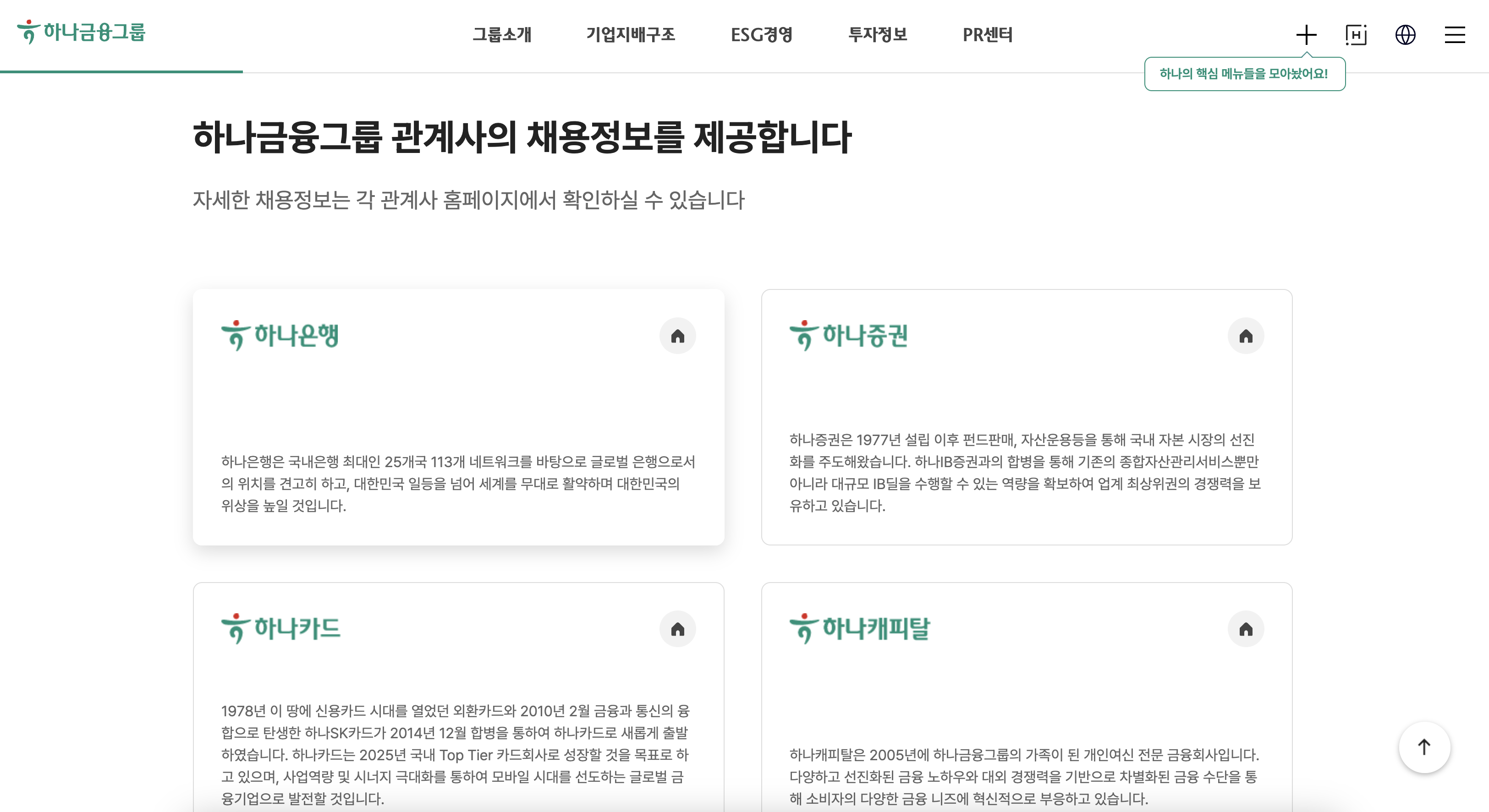 하나금융그룹 채용을 들어가면 하나금융그룹 관계사의 채용정보를 선택할 수 있습니다. 우선 하나은행에 취업을 준비하시는분들이라면 하나은행을 클릭해주셔야겠죠.