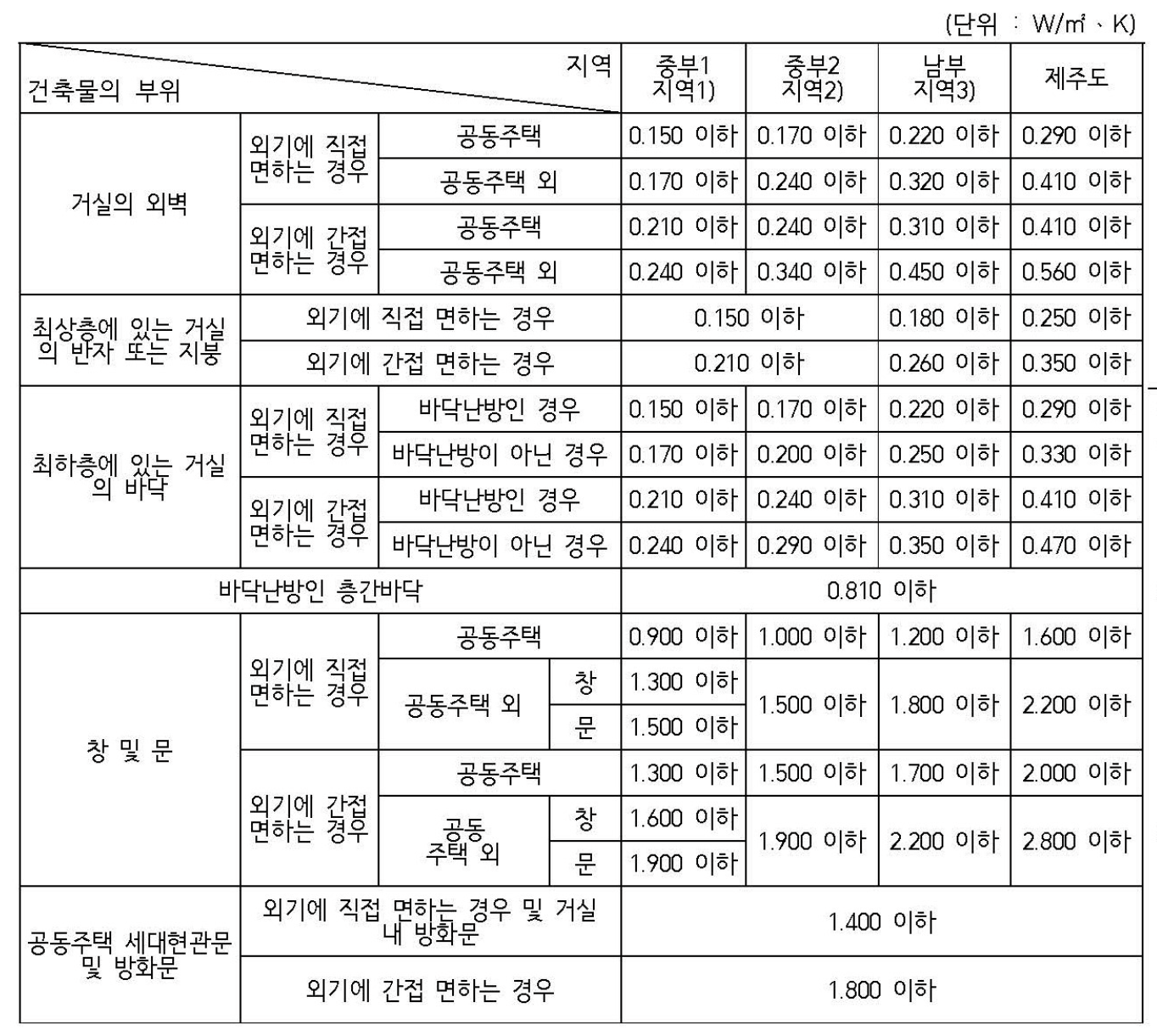 [별표1] 지역별 건축물 부위의 열관류율표