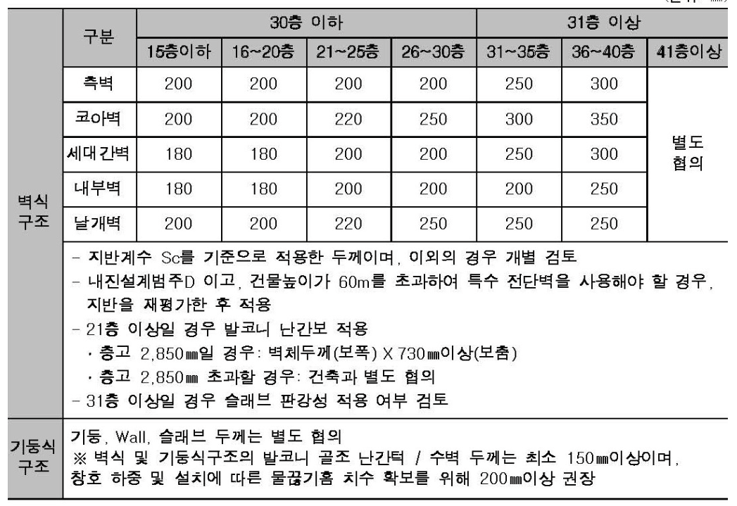 기둥, 벽, 슬라브 두께는 별도 협의합니다. 벽식 및 기둥식구조의 발코니 골조 난간턱 / 수벽 두께는 최소 150mm이상이며, 창호 하중 및 설치에 따른 물끊기홈 치수 확보를 위해 200mm이상 권장합니다.