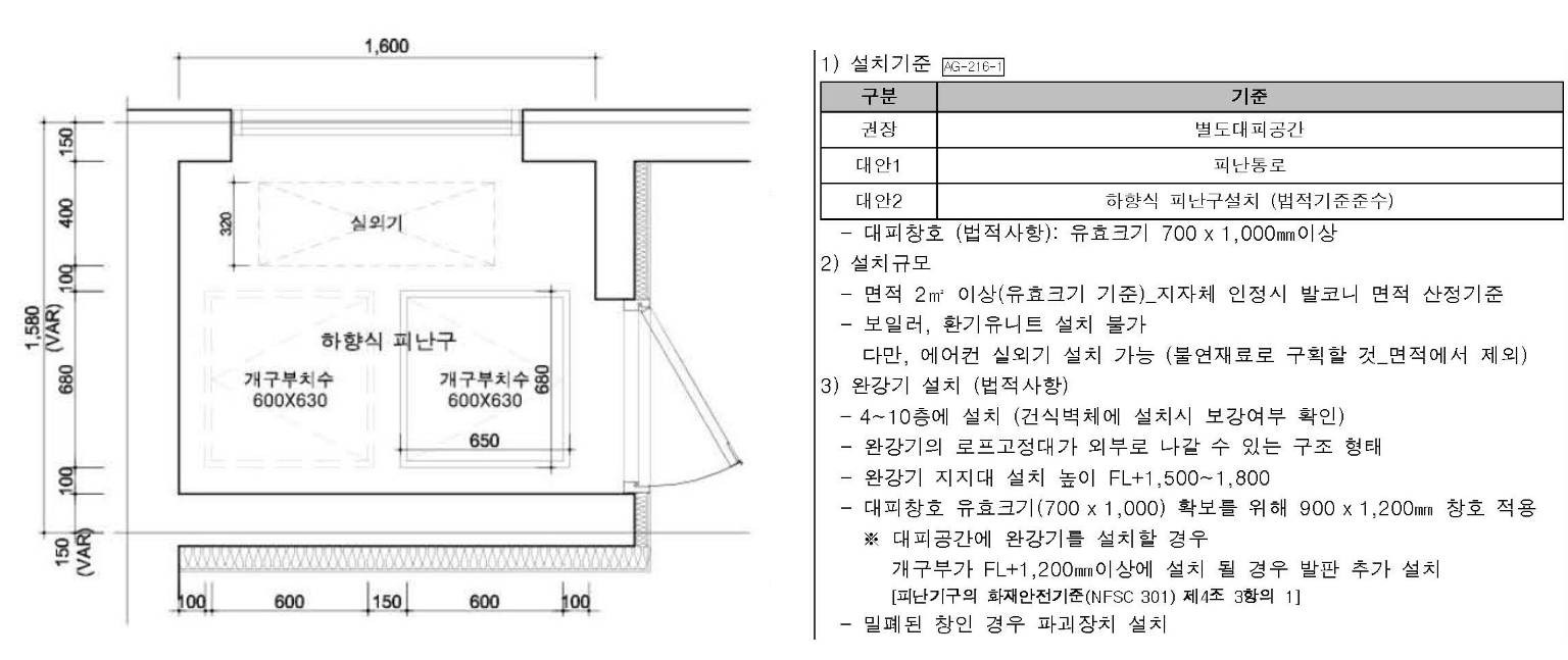 - 대피공간 유효크기 700x1,000 이상 확보 (AG-216대피공간 참조)
