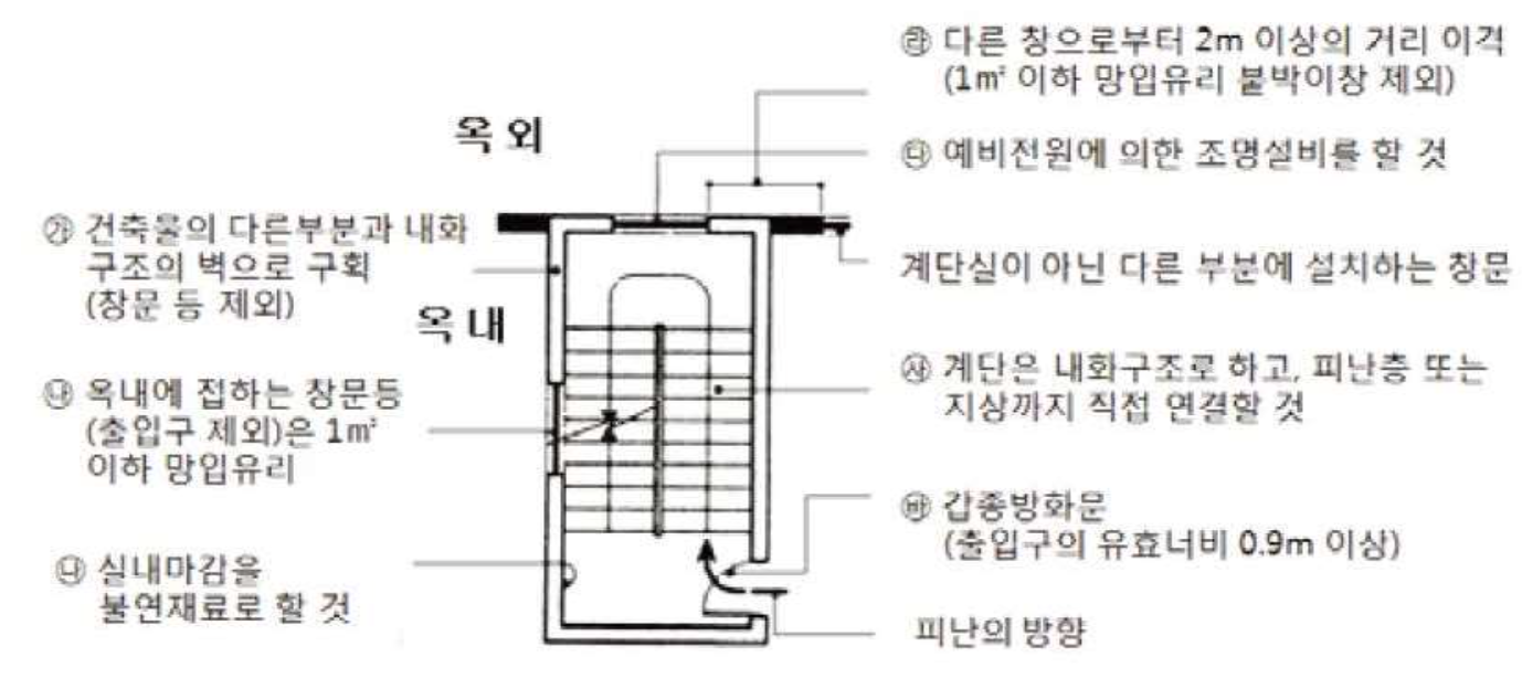 - 계단실의 바깥쪽과 접하는 창문등은 당해 건축물의 다른 부분에 설치하는 창문등으로부터 2미터 이상의 거리를 두고 설치할 것