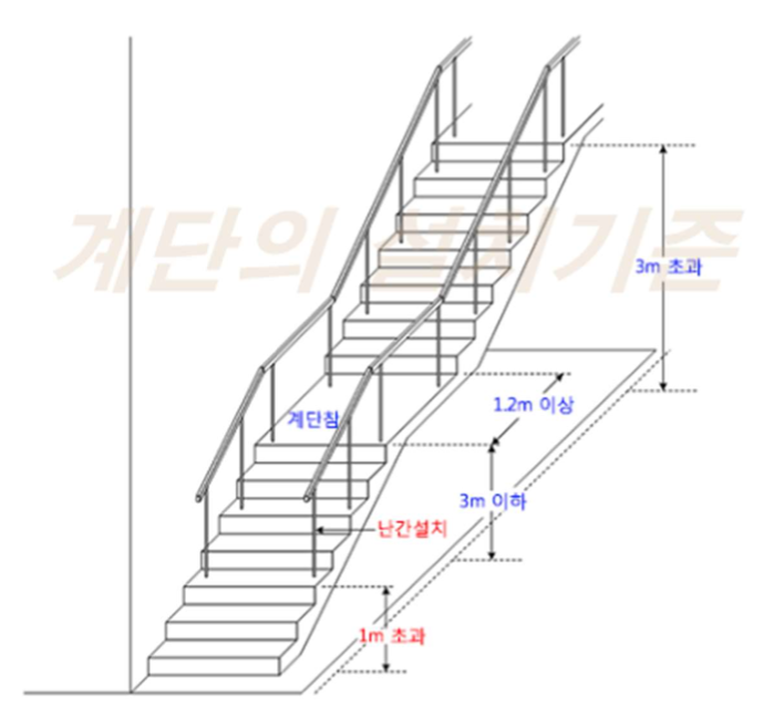 1. 높이가 3미터를 넘는 계단에는 높이 3미터이내 마다 유효너비 120센티미터 이상의 계단참을 설치할 것